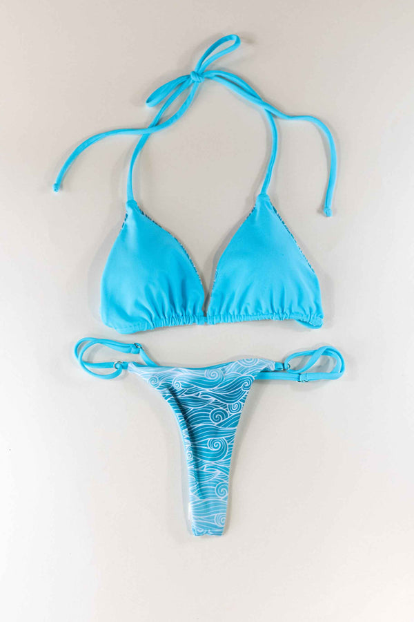 Amarás las olas en degradados azules de este bikini, aunque no acostumbres a tomar el sol. Si tu piel es muy blanca usa el lado liso para evitar que te veas aún más blanca.