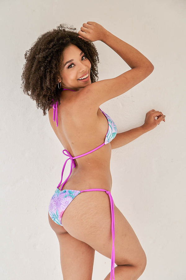 El lado fucsia nos recuerda el cielo de Maui en pleno atardecer y contrasta con el tono azul celeste de los hibiscus típicos de Hawaii.